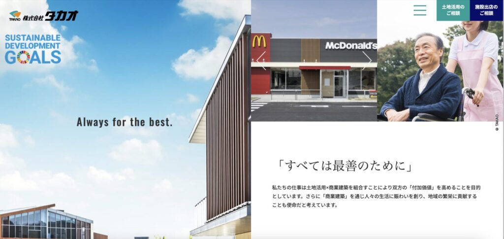 株式会社タカオの運営するメディア「タカオの土地活用窓口」内の記事「建設から暮らしまでを支える!注目の不動産・建設メディアをご紹介」に当社が掲載されました。活用×商業建築を組合すことにより双方の「付加価値」を高めることを目的としています。さらに「商業建築」を通じ人々の生活に賑わいを創り、地域の繁栄に貢献することも使命と考え設立から40年以上の信頼と豊富な実績で、弊社の豊富なテナント企業様情報をもとに、土地活用をお考えの地主様のご要望に沿った提案。