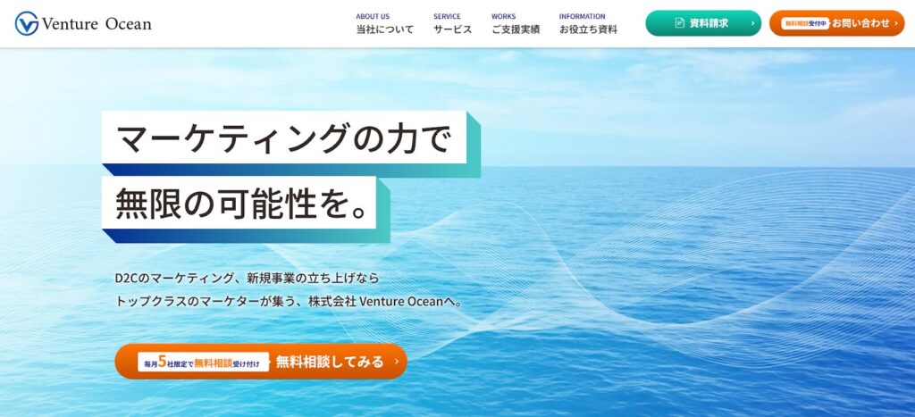 株式会社Venture Oceanは、新規事業やD2Cに特化したマーケティングコンサル会社です。株式会社Venture Oceanでは新規事業立ち上げコンサルティング、D2Cコンサルティング、商品開発コンサルティングなどのサービスを行われています。代表は1年で70億のブランドを立ち上げた経験があり、新規事業のプロが集っております。マーケティングでお悩みの方はぜひ一度、ご相談ください。