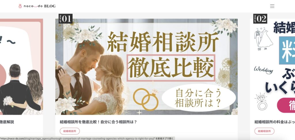 10年後の幸せな結婚生活をゴールに婚活を応援する結婚相談所naco-doです。あなたが心から望む結婚を叶えるためのヒントがここにあるかもしれません。たくさん結婚に特化したコラムが目白押しなので必見です!