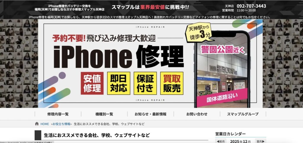 iPhone修理福岡ならスマホ修理スマップル天神店。ガラス割れやバッテリー交換など予約なしでも最短15分~修理対応。いざというとにアップルの修理は待ち時間も長く予約がいっぱい!そんな時にいかがでしょうか?